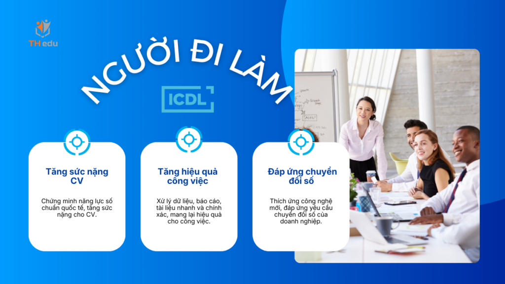 Với người đi làm, ICDL là minh chứng rõ ràng cho năng lực sử dụng công nghệ trong môi trường doanh nghiệp: Xử lý tài liệu nhanh chóng, phân tích dữ liệu chính xác, tối ưu quy trình làm việc.