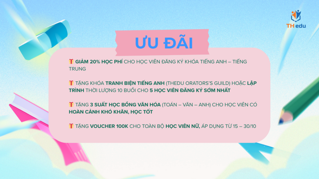 5 học viên đăng ký sớm nhất sẽ được tặng khóa học 10 buổi là Tiếng Anh tranh biện THedu Orators’ Guild, giúp rèn khả năng hùng biện, phản biện logic bằng tiếng Anh hoặc Lập trình cơ bản THedu DevCore, giúp học viên làm quen với tư duy công nghệ và phát triển kỹ năng số.